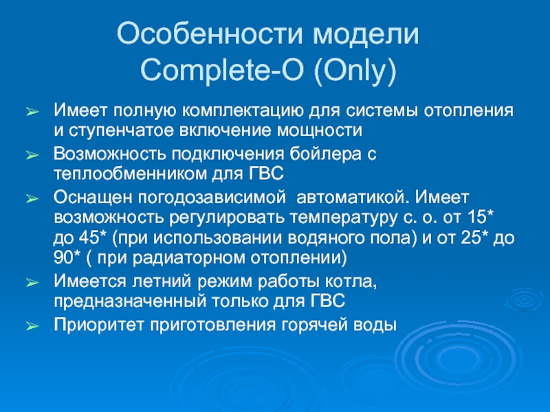 Оснащен погодозависимой автоматикой. Имеет возможность регулировать температуру с. о. от 15* до 45* (при использовании водяного пола) и от 25* до 90* ( при радиаторном отоплении)