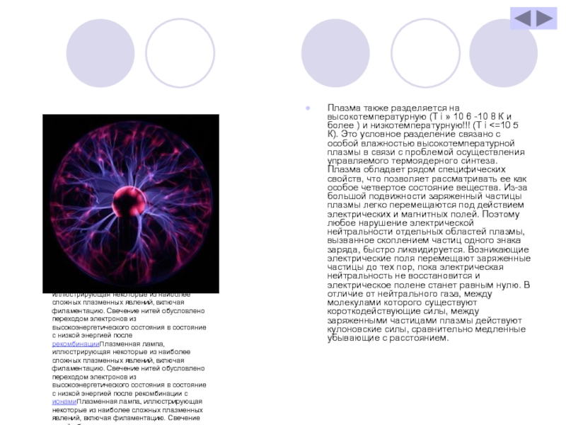Плазменная лампаПлазменная лампа, иллюстрирующая некоторые из наиболее сложных плазменных явлений, включая филаментациюПлазменная лампа, иллюстрирующая некоторые из наиболее сложных плазменных явлений, включая филаментацию. Свечение нитей обусловлено переходом электроновПлазменная лампа, иллюстрирующая некоторые из наиболее сложных плазменных явлений, включая филаментацию. Свечение нитей обусловлено переходом электронов из высокоэнергетического состояния в состояние с низкой энергией после рекомбинацииПлазменная лампа, иллюстрирующая некоторые из наиболее сложных плазменных явлений, включая филаментацию. Свечение нитей обусловлено переходом электронов из высокоэнергетического состояния в состояние с низкой энергией после рекомбинации с ионамиПлазменная лампа, иллюстрирующая некоторые из наиболее сложных плазменных явлений, включая филаментацию. Свечение нитей обусловлено переходом электронов из высокоэнергетического состояния в состояние с низкой энергией после рекомбинации с ионами. Этот процесс приводит к излучению со спектром, соответствующим возбуждаемому газу.