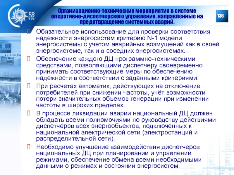 Слайд 136Организационно-технические мероприятия в системе оперативно-диспетчерского управления, направленные на предотвращение системных аварий.