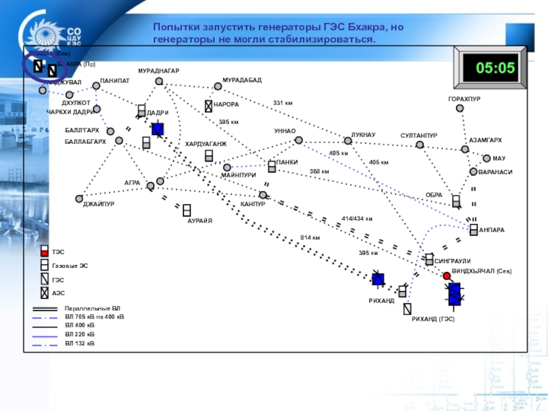 (E.ON: 22:47:11) – ЛЭП-380 Bechterdissen - Elsen (2); разница частот перед подключением была около 180 мГц; разница фазового угла на концах линии - менее 10°