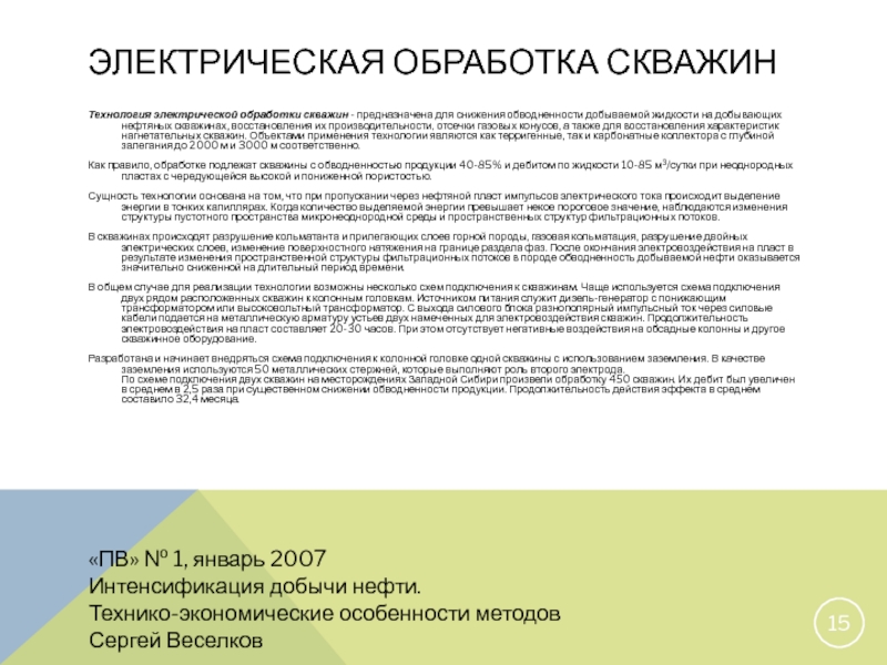 Технология электрической обработки скважин - предназначена для снижения обводненности добываемой жидкости на добывающих нефтяных скважинах, восстановления их производительности, отсечки газовых конусов, а также для восстановления характеристик нагнетательных скважин. Объектами применения технологии являются как терригенные, так и карбонатные коллектора с глубиной залегания до 2000 м и 3000 м соответственно.