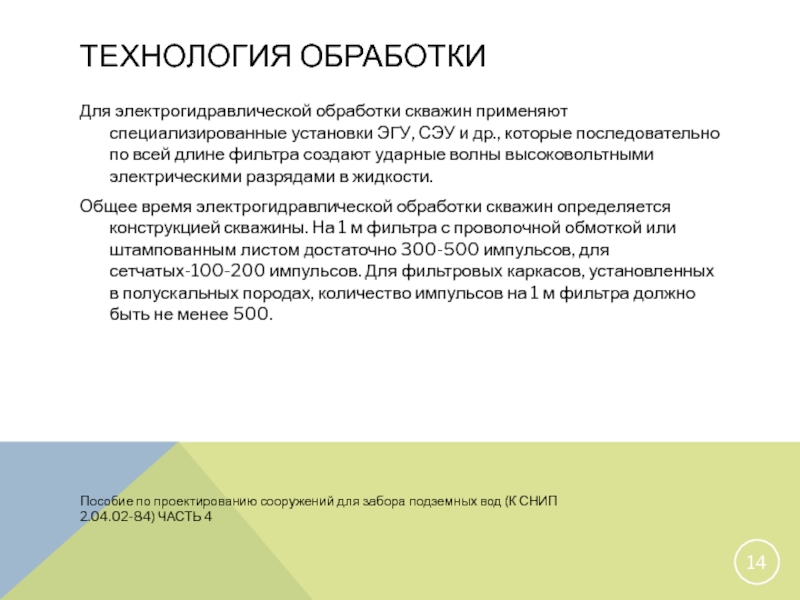 Общее время электрогидравлической обработки скважин определяется конструкцией скважины. На 1 м фильтра с проволочной обмоткой или штампованным листом достаточно 300-500 импульсов, для сетчатых-100-200 импульсов. Для фильтровых каркасов, установленных в полускальных породах, количество импульсов на 1 м фильтра должно быть не менее 500.