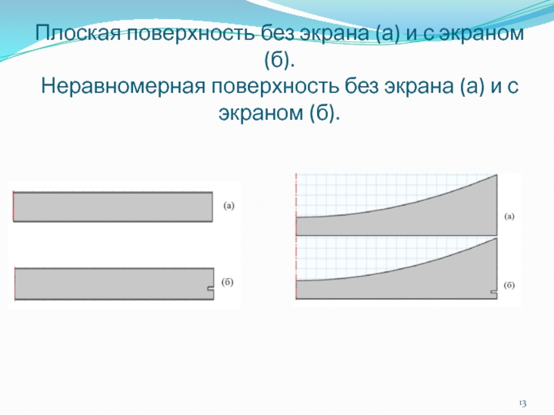 Слайд 13Плоская поверхность без экрана (а) и с экраном (б).