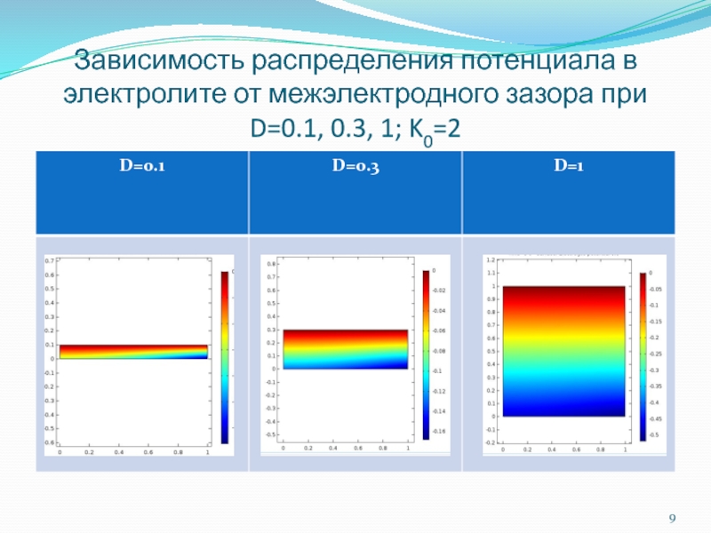 Слайд 9Зависимость распределения потенциала в электролите от межэлектродного зазора при D=0.1, 0.3,