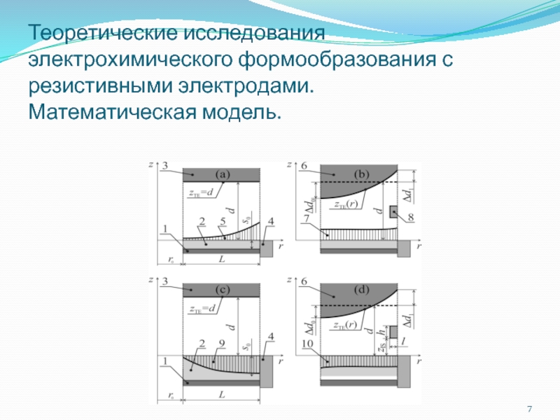 Слайд 7Теоретические исследования электрохимического формообразования с резистивными электродами.