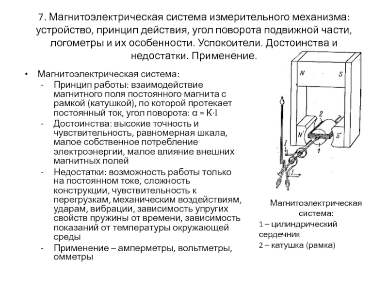 Магнитоэлектрическая система измерительного механизма: устройство, принцип действия, угол поворота подвижной части, логометры и их особенности. Успокоители. Достоинства и недостатки. Применение.