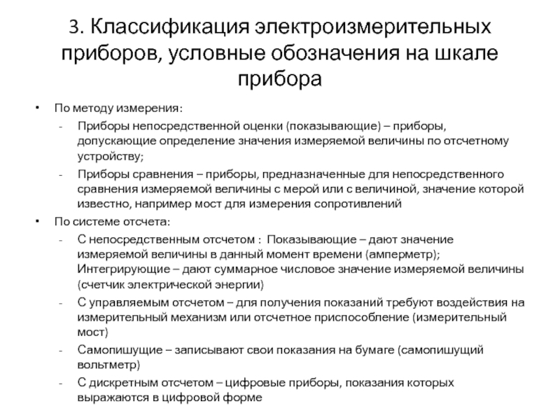 С непосредственным отсчетом : Показывающие – дают значение измеряемой величины в данный момент времени (амперметр); Интегрирующие – дают суммарное числовое значение измеряемой величины (счетчик электрической энергии)