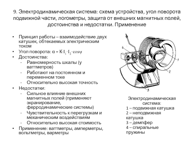 Электродинамическая система: схема устройства, угол поворота подвижной части, логометры, защита от внешних магнитных полей, достоинства и недостатки. Применение.