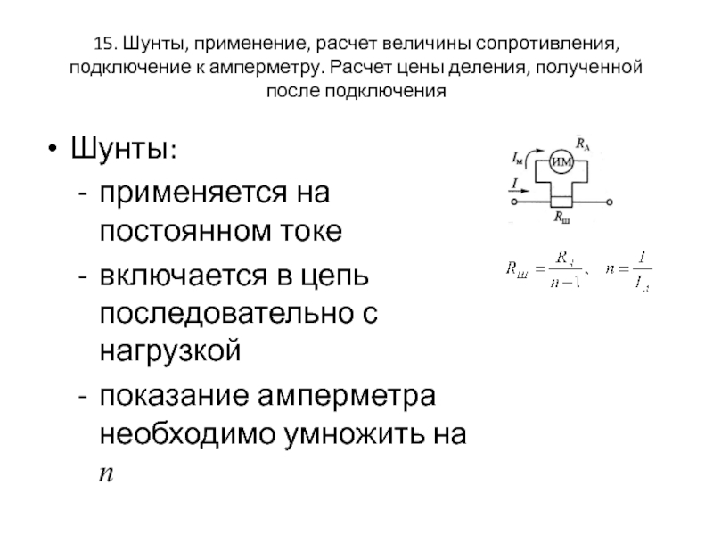 Шунты, применение, расчет величины сопротивления, подключение к амперметру. Расчет цены деления, полученной после подключения.
