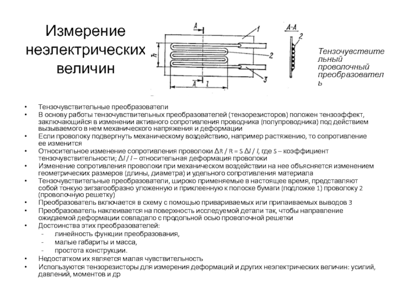 Используются тензорезисторы для измерения деформаций и других неэлектрических величин: усилий, давлений, моментов и др