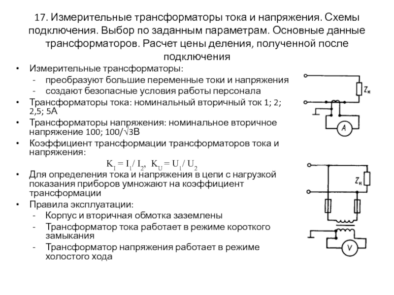 Измерительные трансформаторы тока и напряжения. Схемы подключения. Выбор по заданным параметрам. Основные данные трансформаторов. Расчет цены деления, полученной после подключения.