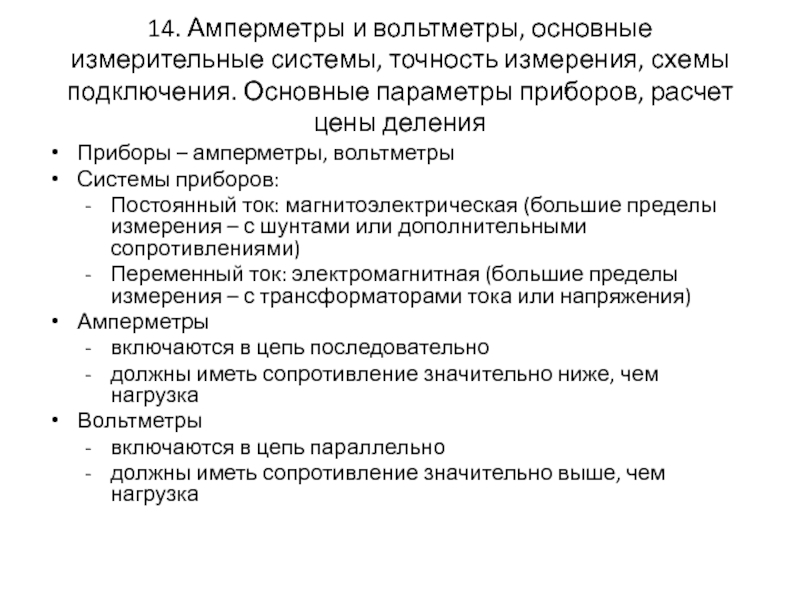 Амперметры и вольтметры, основные измерительные системы, точность измерения, схемы подключения. Основные параметры приборов, расчет цены деления.