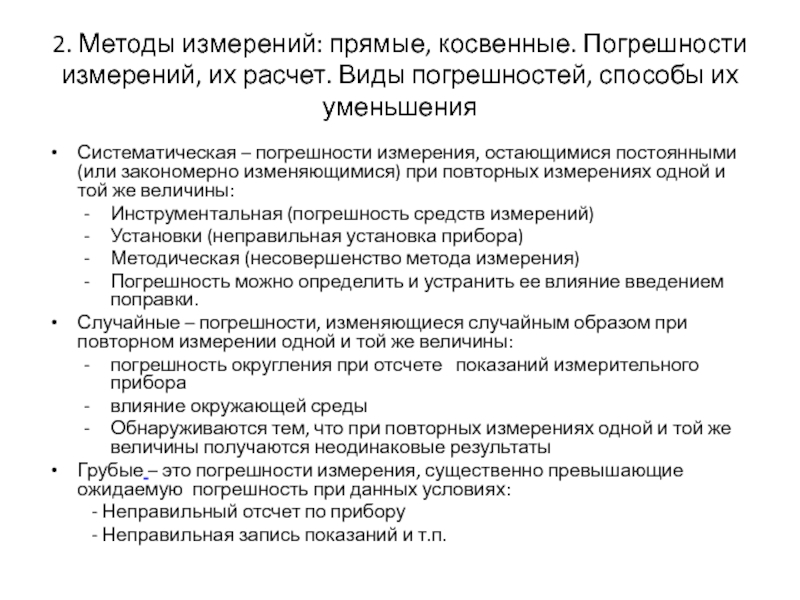 Слайд 102. Методы измерений: прямые, косвенные. Погрешности измерений, их расчет. Виды погрешностей,