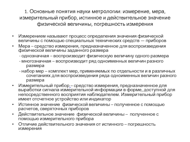 Слайд 71. Основные понятия науки метрологии: измерение, мера, измерительный прибор, истинное и