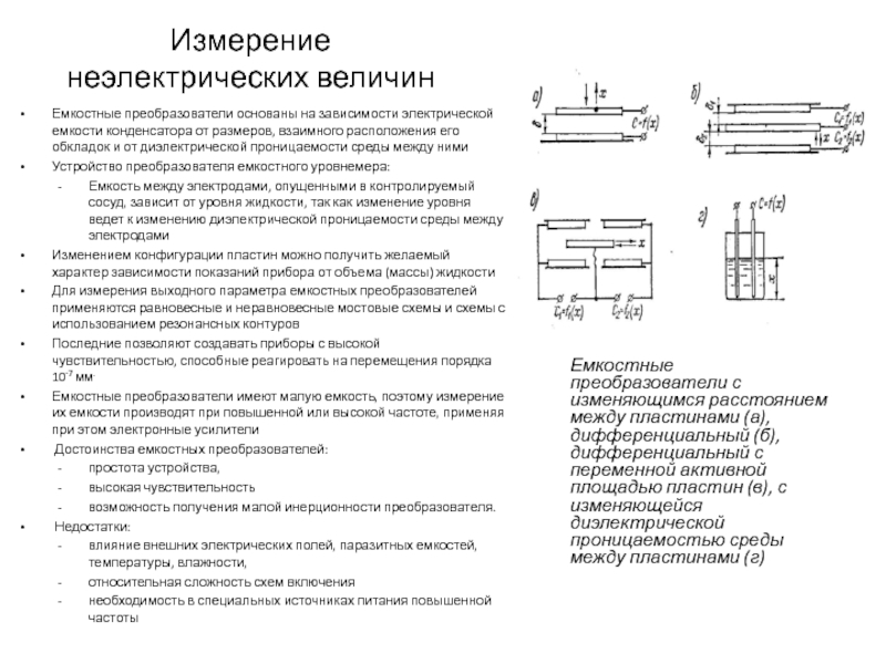 Емкостные преобразователи с изменяющимся расстоянием между пластинами (а), дифференциальный (б), дифференциальный с переменной активной площадью пластин (в), с изменяющейся диэлектрической проницаемостью среды между пластинами (г)