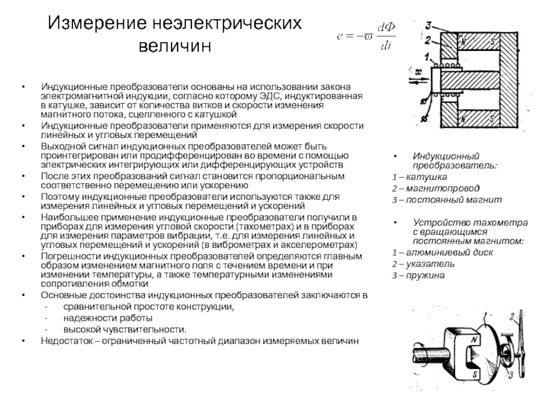 Наибольшее применение индукционные преобразователи получили в приборах для измерения угловой скорости (тахометрах) и в приборах для измерения параметров вибрации, т.е. для измерения линейных и угловых перемещений и ускорений (в виброметрах и акселерометрах)