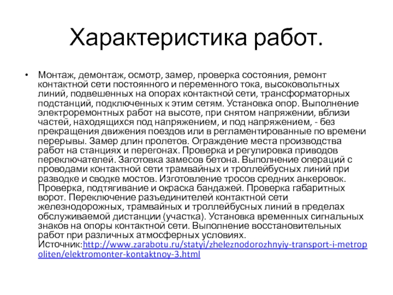 и переменного тока, высоковольтных линий, подвешенных на опорах контактной сети, трансформаторных подстанций, подключенных к этим сетям. Установка опор. Выполнение электроремонтных работ на высоте, при снятом напряжении, вблизи частей, находящихся под напряжением, и под напряжением, - без прекращения движения поездов или в регламентированные по времени перерывы. Замер длин пролетов. Ограждение места производства работ на станциях и перегонах. Проверка и регулировка приводов переключателей. Заготовка замесов бетона. Выполнение операций с проводами контактной сети трамвайных и троллейбусных линий при разводке и сводке мостов. Изготовление тросов средних анкеровок. Проверка, подтягивание и окраска бандажей. Проверка габаритных ворот. Переключение разъединителей контактной сети железнодорожных, трамвайных и троллейбусных линий в пределах обслуживаемой дистанции (участка). Установка временных сигнальных знаков на опоры контактной сети. Выполнение восстановительных работ при различных атмосферных условиях.