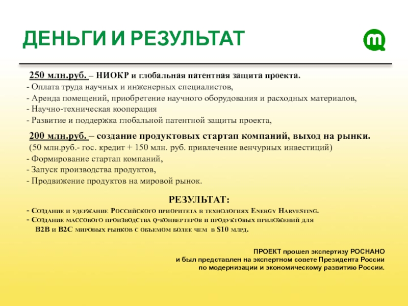 250 млн.руб. – НИОКР и глобальная патентная защита проекта.