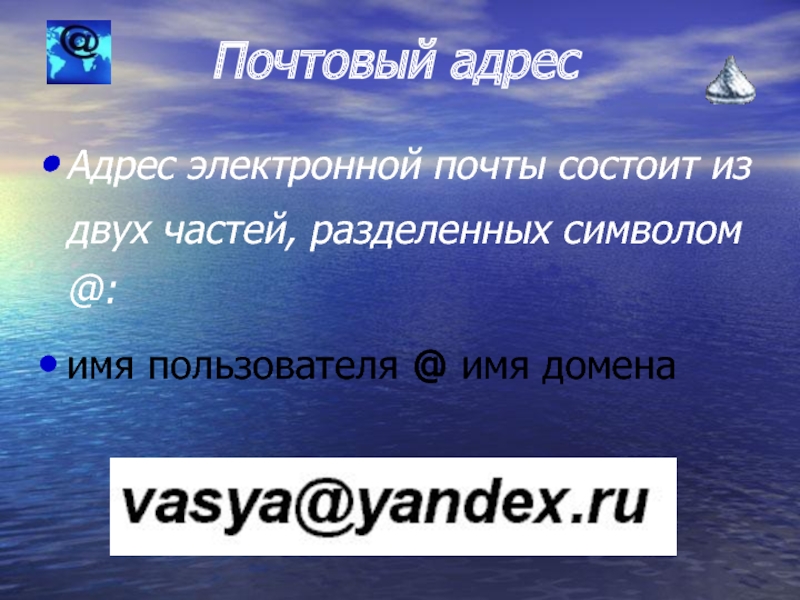 Адрес электронной почты состоит из двух частей, разделенных символом @: