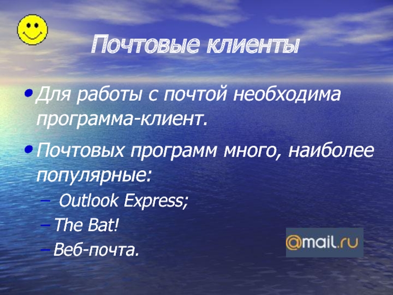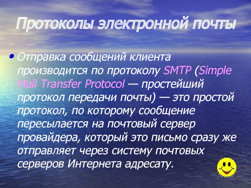 Transfer Protocol — простейший протокол передачи почты) — это простой протокол, по которому сообщение пересылается на почтовый сервер провайдера, который это письмо сразу же отправляет через систему почтовых серверов Интернета адресату.