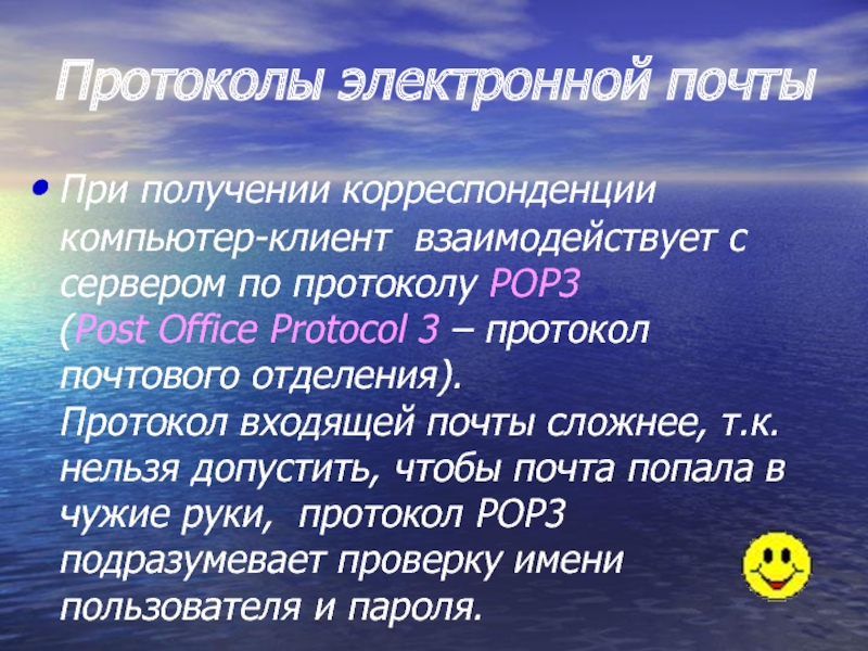 При получении корреспонденции компьютер-клиент взаимодействует с сервером по протоколу