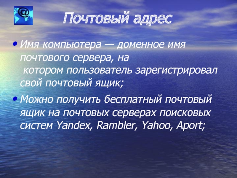 Можно получить бесплатный почтовый ящик на почтовых серверах поисковых систем Yandex, Rambler, Yahoo, Aport;