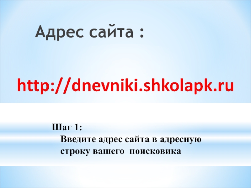 Слайд 2Шаг 1: Введите адрес сайта в адресную строку вашего поисковика