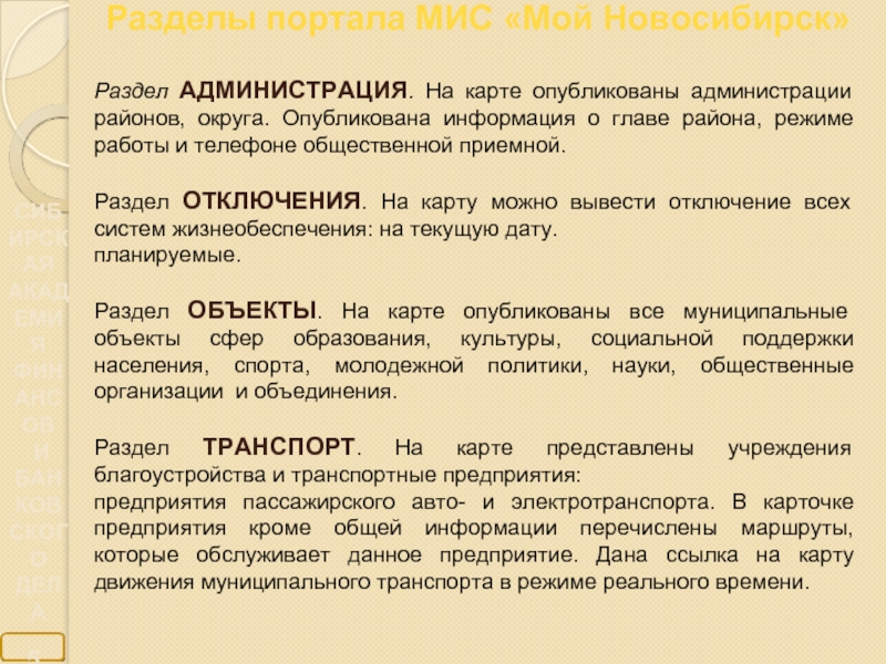 Слайд 4Разделы портала МИС «Мой Новосибирск»