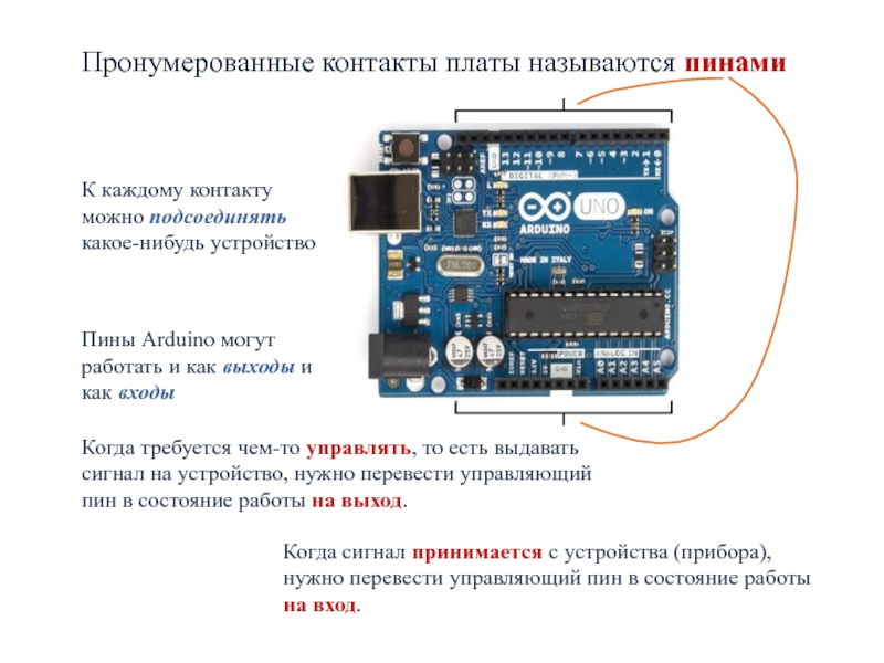 Когда требуется чем-то управлять, то есть выдавать сигнал на устройство, нужно перевести управляющий пин в состояние работы на выход.