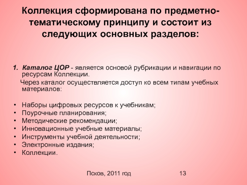 1. Каталог ЦОР - является основой рубрикации и навигации по ресурсам Коллекции.