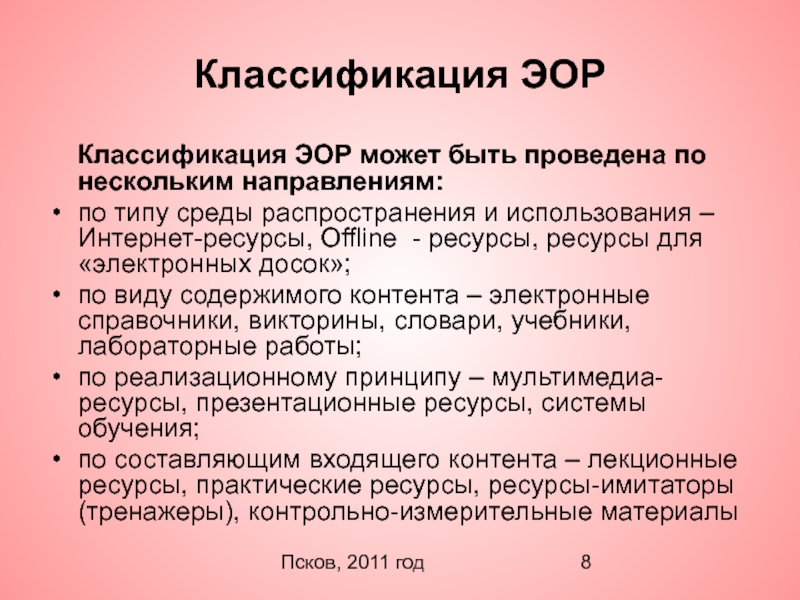 по типу среды распространения и использования – Интернет-ресурсы, Offline - ресурсы, ресурсы для «электронных досок»;