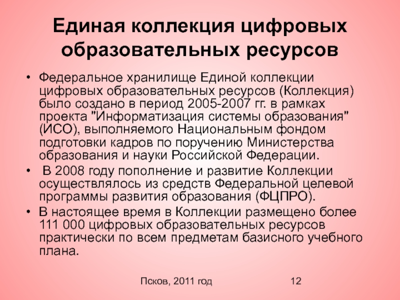 образовательных ресурсов (Коллекция) было создано в период 2005-2007 гг. в рамках проекта "Информатизация системы образования" (ИСО), выполняемого Национальным фондом подготовки кадров по поручению Министерства образования и науки Российской Федерации.