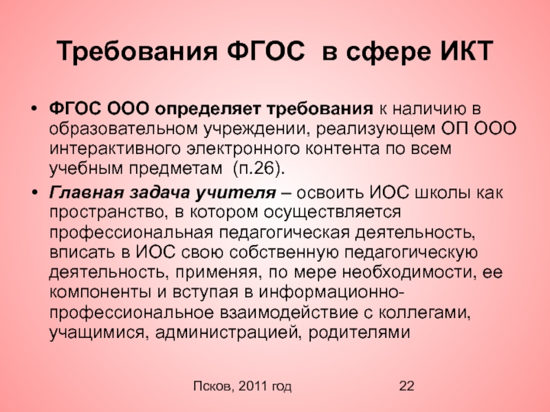 Главная задача учителя – освоить ИОС школы как пространство, в котором осуществляется профессиональная педагогическая деятельность, вписать в ИОС свою собственную педагогическую деятельность, применяя, по мере необходимости, ее компоненты и вступая в информационно-профессиональное взаимодействие с коллегами, учащимися, администрацией, родителями