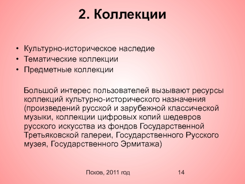 Большой интерес пользователей вызывают ресурсы коллекций культурно-исторического назначения (произведений русской и зарубежной классической музыки, коллекции цифровых копий шедевров русского искусства из фондов Государственной Третьяковской галереи, Государственного Русского музея, Государственного Эрмитажа)