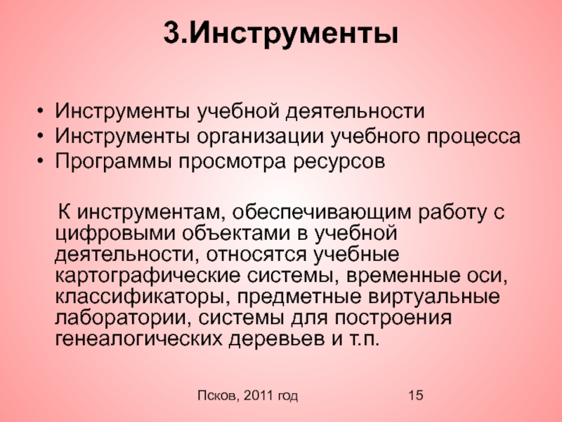 К инструментам, обеспечивающим работу с цифровыми объектами в учебной деятельности, относятся учебные картографические системы, временные оси, классификаторы, предметные виртуальные лаборатории, системы для построения генеалогических деревьев и т.п.