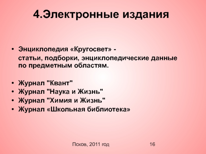 по виду содержимого контента – электронные справочники, викторины, словари, учебники, лабораторные работы;