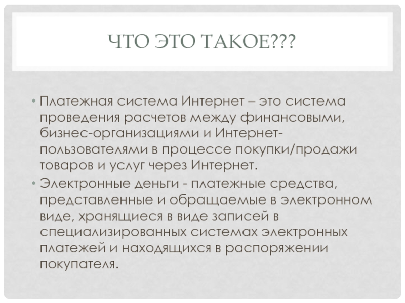 Электронные деньги - платежные средства, представленные и обращаемые в электронном виде, хранящиеся в виде записей в специализированных системах электронных платежей и находящихся в распоряжении покупателя.