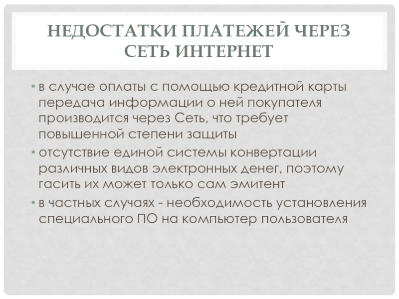 Слайд 18НЕДОСТАТКИ ПЛАТЕЖЕЙ ЧЕРЕЗ СЕТЬ ИНТЕРНЕТ