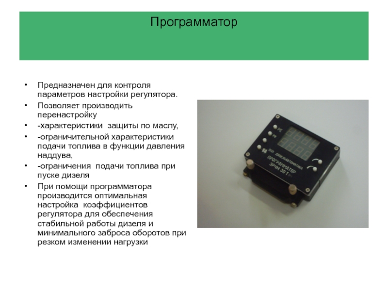 При помощи программатора производится оптимальная настройка коэффициентов регулятора для обеспечения стабильной работы дизеля и минимального заброса оборотов при резком изменении нагрузки