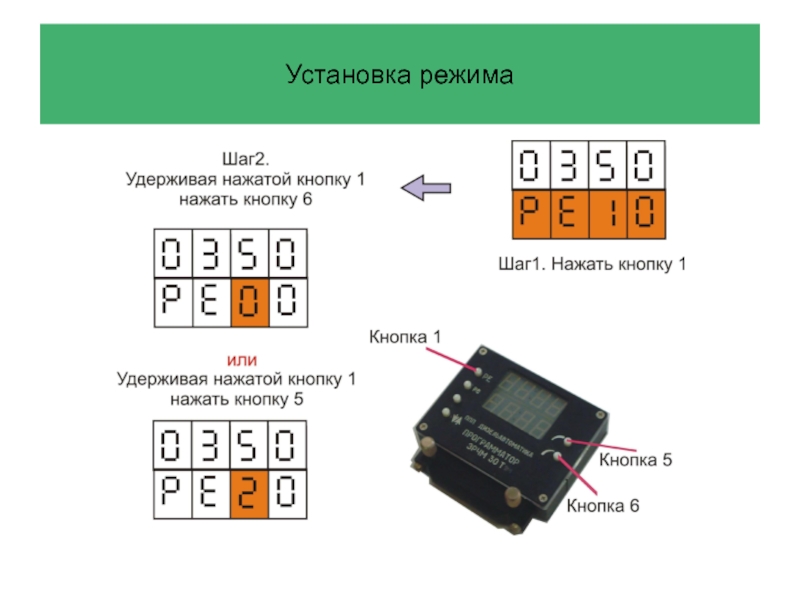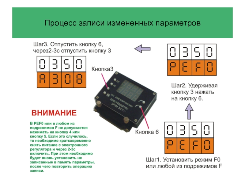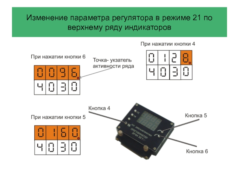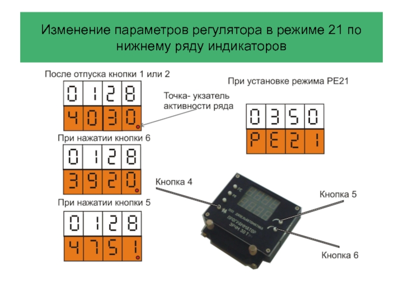 Слайд 30Изменение параметров регулятора в режиме 21 по нижнему ряду индикаторов