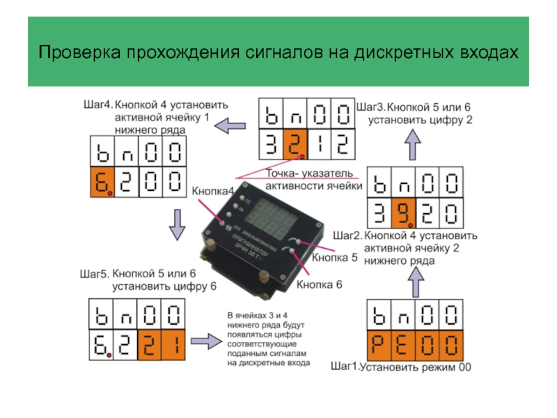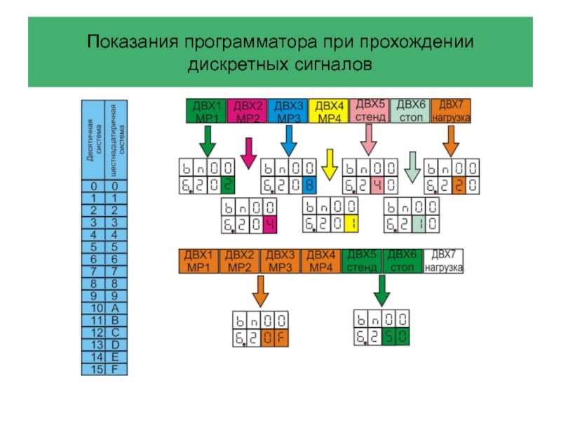 Слайд 34Показания программатора при прохождении дискретных сигналов