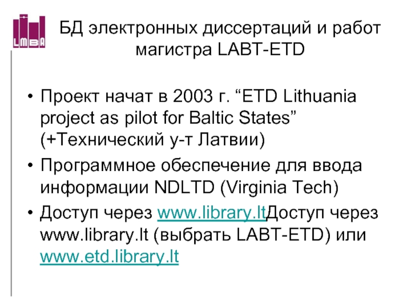 Слайд 16БД электронных диссертаций и работ магистра LABT-ETD