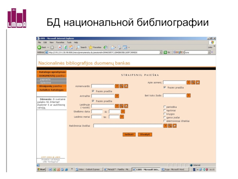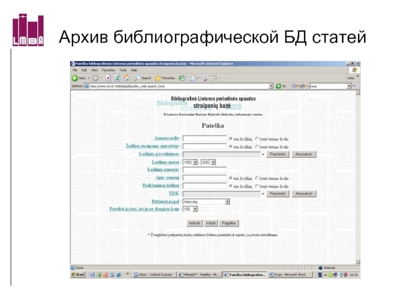 Архив библиографической БД статей литовской периодики (1994-2002) on-line