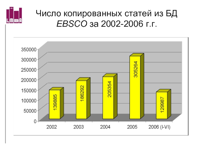 Слайд 55Число копированных статей из БД EBSCO за 2002-2006 г.г.