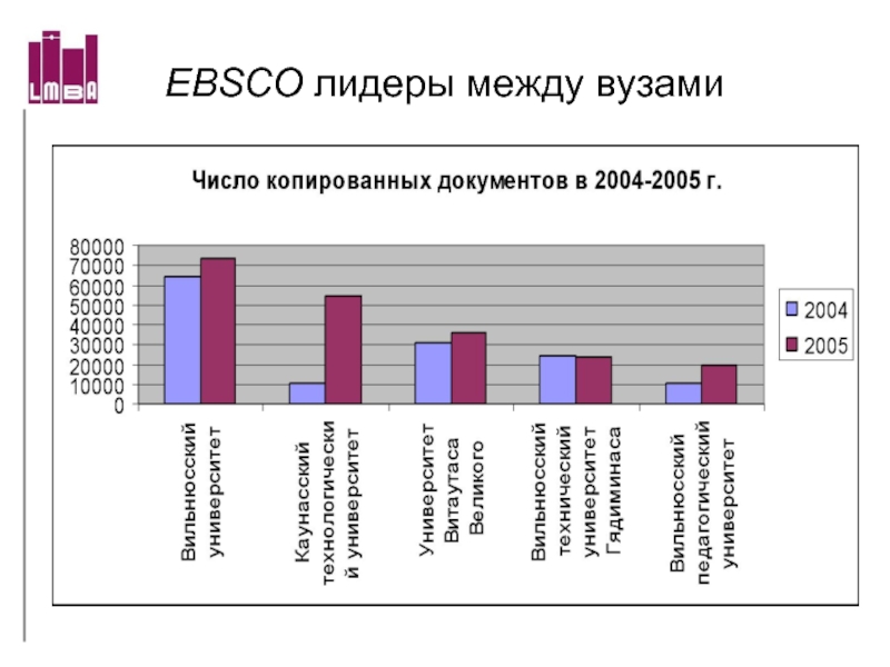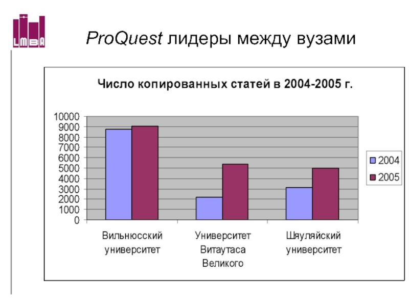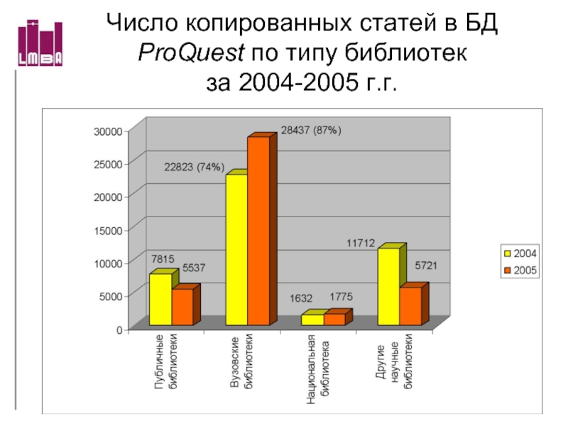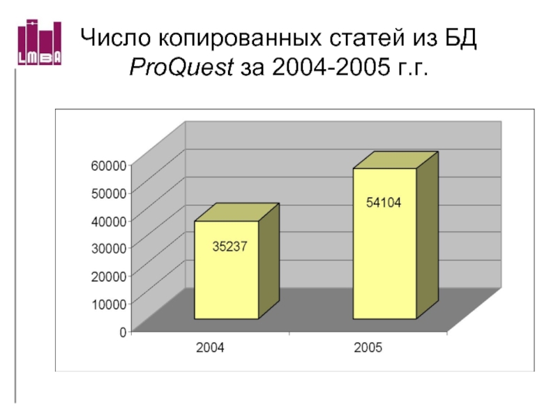 Слайд 60Число копированных статей из БД ProQuest за 2004-2005 г.г.