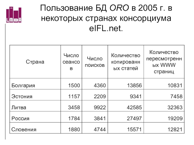 Слайд 70Пользование БД ORO в 2005 г. в некоторых странах консорциума eIFL.net.