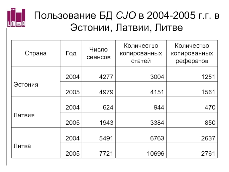 Слайд 67Пользование БД CJO в 2004-2005 г.г. в Эстонии, Латвии, Литве