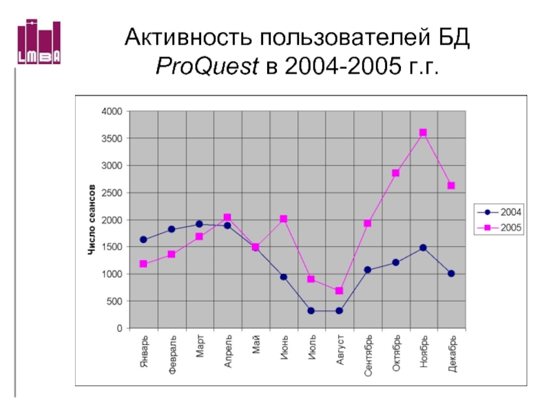 Слайд 63Активность пользователей БД ProQuest в 2004-2005 г.г.