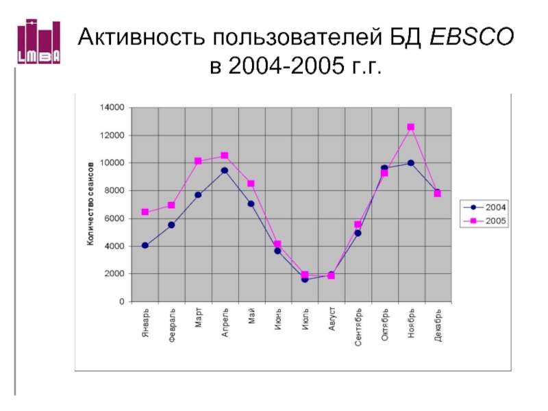 Слайд 58Активность пользователей БД EBSCO в 2004-2005 г.г.
