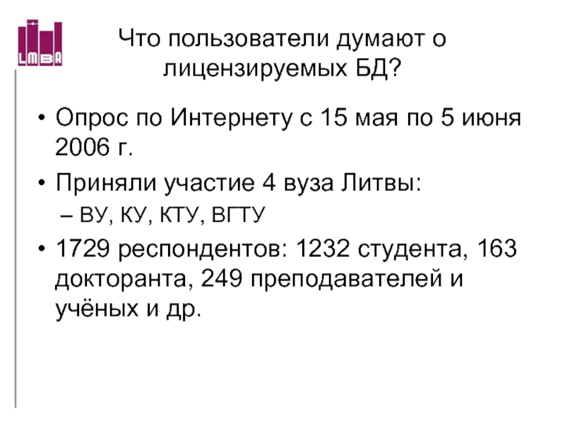 Третьей – библиотека Вильнюсского технического университета, с 1999 г. подписавшая лицензионный договор на Applied Science & Technology Plus (издатель Bell & Howell, UMI) на CD-ROMах